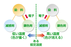 感温染料の内包物は染料・顕色剤・減感剤の3つが基本となります。染料は単独では無色ですが、顕色剤に電子を与えると構造が変わって発色します。一方、減感剤は、ある温度以上になると、こうした電子の授受を阻害する物質で、変色温度は概ねこの成分に由来します。これらの成分の選択により、色・発色濃度・変色温度が決定されます。