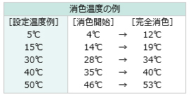 感温染料は温度によって、可逆的に(発色)←→(消色)の変化をする成分をマイクロカプセル化したものです。ある特定の温度より低温側では発色し、高温側では消色します。(発色)←→(消色)は繰り返し行うことが可能です。(有色)←→(無色)の変化が通常ですが、カプセルの他に一般的な顔料を加えることで、(有色)←→(有色)の変化も可能となります。カプセルが水溶液中に分散したスラリータイプと、水分を除去して乾燥したパウダータイプがあります。色はブラック、スカイブルー、グリーン、レッド、オレンジの5種類で、各色によって設定温度が異なります。